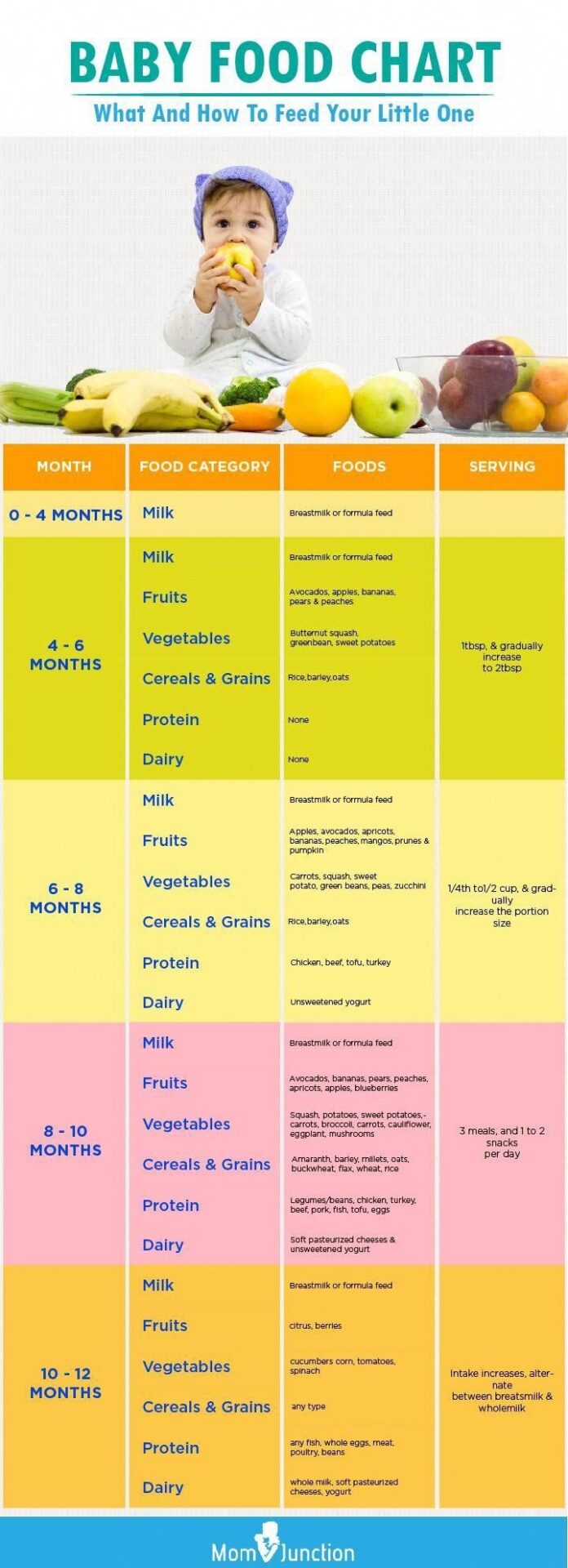 If you have already started your baby on solids, then it is always best to plan what they need to eat in advance. I find this chart from BabyCenter and MomJunction particularly helpful. You can always tailor their meals to similar food items in your locality.