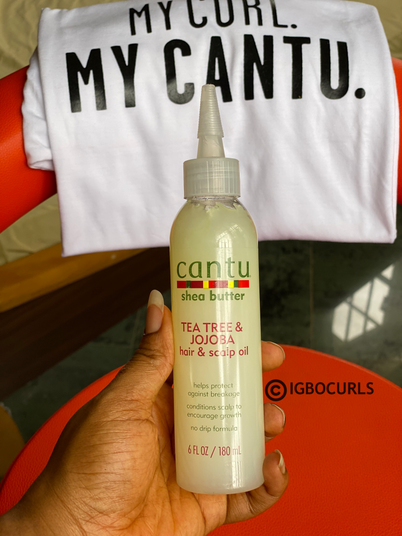 To seal everything in, I used the Cantu Tea Tree & Jojoba hair and scalp oil. I particularly love this oil because it is light, absorbs fast and it comes with an applicator cap.